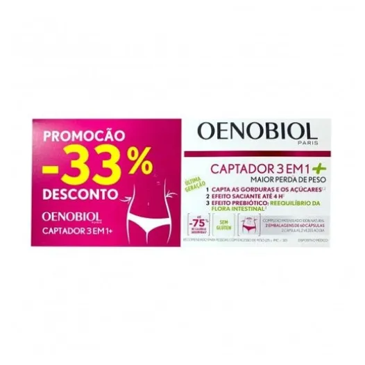 Oenobiol Captador 3 in 1 2x60caps ist ein Nahrungsergänzungsmittel für Erwachsene, die abnehmen wollen.