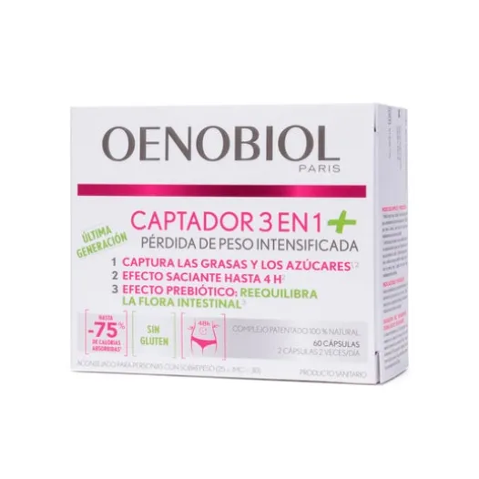 Oenobiol Captador 3in1 Plus 60caps ist ein Nahrungsergänzungsmittel mit einem Ballaststoffkomplex, der die Darmflora reguliert und die Population nützlicher Bakterien zur Gewichtsabnahme erhöht, mit probiotischer Wirkung.