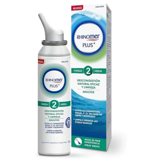 Rhinomer Plus 2 Mittlere Stärke: 100% natürliches hypertonisches Meerwasser für Erwachsene und Kinder ab 6 Jahren. Zur natürlichen Linderung von Nasenverstopfung bei z. B. Erkältungen, Nasenallergien und Rhinosinusitis.