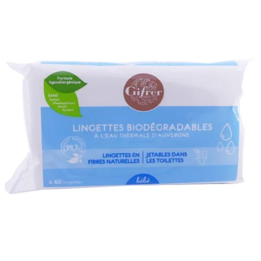 Gifrer Thermalwasser-Tücher 60 Tücher sind biologisch abbaubare Tücher mit Thermalwasser, die die empfindliche Haut von Babys sanft reinigen, hydratisieren und beruhigen. 99,7% der Inhaltsstoffe dieser Tücher sind natürlichen Ursprungs, davon sind 98,95% Wasser, und sie werden aus natürlichen Fasern hergestellt, die aus nachhaltig bewirtschafteten Wäldern (FSC) stammen. Das Thermalwasser aus der Auvergne, reich an Mineralien und Spurenelementen, fördert die Heilung der Haut und die Zellerneuerung und schützt sie gleichzeitig vor der Säure von Kot und Urin in der Windel. Geeignet für Kinder, Jugendliche und Erwachsene zur Reinigung des Gesäßes, des Gesichts und der Hände. Abspülbar.