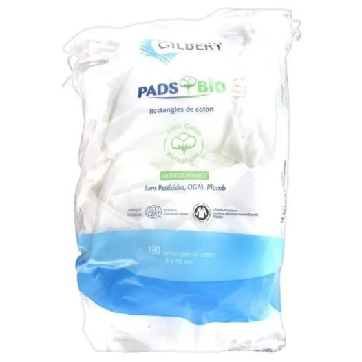 Gilbert Pads Bio Rectangles De Coton 180 Stück sind für die Pflege der zarten Babyhaut oder zum Abschminken von empfindlicher Haut bestimmt.100% biologisch abbaubar, bestehen diese Baumwollrechtecke aus seidigen, reinen Baumwollfasern, die besser absorbieren als Vlies- und Mulltücher.Hergestellt in Europa nach den Standards des ökologischen Landbaus.Pestizidfrei, GVO-frei, bleifrei.Hypoallergen.Maße: 8 x 10 cm.