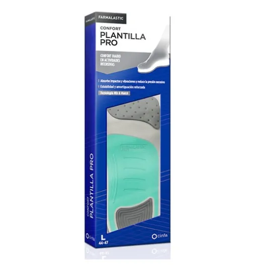 Farmalastic Pro Intensive Activity Einlegesohlen Alltagseinlegesohlen mit einer Struktur aus mehr Steifigkeit und anatomischem Design für mehr Stabilität und Halt, ohne an Komfort zu verlieren. Die Basis besteht aus thermoplastischem Elastomergel, das Stöße und Kissen absorbiert. Die Sohle ist aus weichem Stoff gefertigt und bekämpft alle Bakterien, um schlechte Gerüche zu beseitigen. Größe M 44-47.