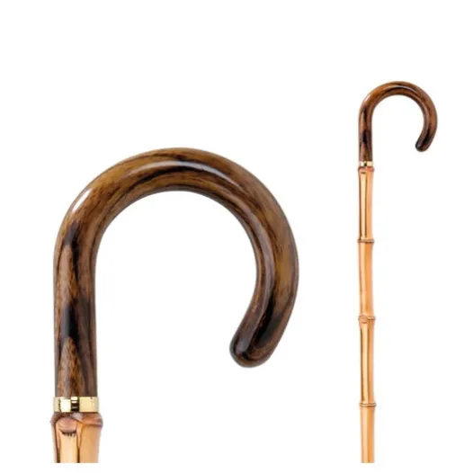 Stock mit Bambusstock, der Menschen mit eingeschränkter Mobilität hilft. Verstellbares Format mit Griff aus Holz oder Methacrylat in Holzoptik, runde Form, Spitze ca. Ø20mm.