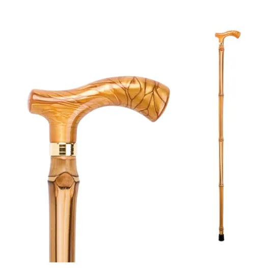 Stock mit Bambusrohr, der Menschen mit eingeschränkter Mobilität hilft. Verstellbares Format mit einem Griff aus Methacrylat in Holzoptik oder aus Holz und einer Spitze von etwa Ø20mm.