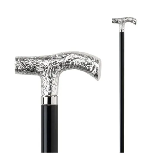 Stock mit Holzgriff, der Menschen mit eingeschränkter Mobilität unterstützt. Verstellbares Modell mit versilbertem Metallgriff, verziert und graviert, schwarzer Stock und eine ca. Ø20mm große Spitze.