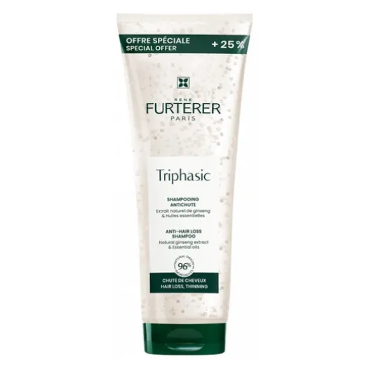 René Furterer Triphasic Ritual Anti-Haarausfall 250ml ist ein Shampoo, das hilft, das Haar zu stärken und Haarausfall zu verhindern. Die auf ätherischen Ölen basierende Formulierung enthält Pfaffia-Extrakt, der die Wirkung gegen Haarausfall verstärkt und die Mikrozirkulation anregt