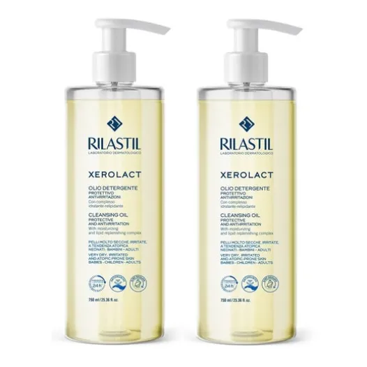 Rilastil Pack Xerolact Huile nettoyante 2x750ml Gesichtsreinigungsöl mit einer sanften Textur, die speziell für die Tiefenreinigung sehr trockener und zu Neurodermitis neigender Haut entwickelt wurde. Es hilft, Make-up, Unreinheiten und oxidierten Talg zu lösen, lindert Juckreiz, spendet Feuchtigkeit und stellt die Hautbarriere wieder her.
