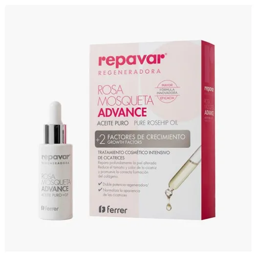 Repavar Advance Reines Wildrosenöl hat heilende und entzündungshemmende Eigenschaften und wirkt besonders intensiv gegen Falten, Flecken, Schwangerschaftsstreifen, Cellulite, Ausschläge, Verbrennungen… Mit Repavar werden diese Unregelmäßigkeiten schnell gelindert und die Haut wird intensiv mit Feuchtigkeit versorgt, so dass sie ihre Elastizität zurückerhält.