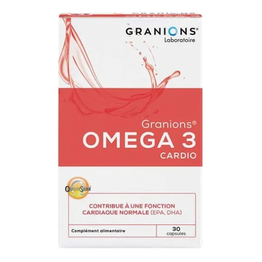 Das Nahrungsergänzungsmittel Omega 3 Cardio aus dem Granions-Labor:- Trägt dazu bei, das Verhältnis zwischen Omega 3 und Omega 6 in der Ernährung wieder ins Gleichgewicht zu bringen- Trägt zur normalen Funktion des Herzens bei (1)- EPA/DHA-Öl Qualitysilver® Epax® (1), patentierter Wirkstoff Qualitysilve® (1), Anspruch in Verbindung mit EPA/DHA-Öl Epax.