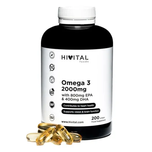 Hivital Foods Omega 3 2000mg 200Capsist ein Nahrungsergänzungsmittel, das zum Schutz des Herz-Kreislauf-Systems beiträgt. Formuliert aus Fischöl mit einem hohen Gehalt anOmega 3, EPA und DHA, die zur Erhaltung eines gesunden Herzens, Sehvermögens und Gehirns beitragen . Es enthält auch Vitamin E, das in die Zellen eindringt und sie vor oxidativen Schäden schützt.