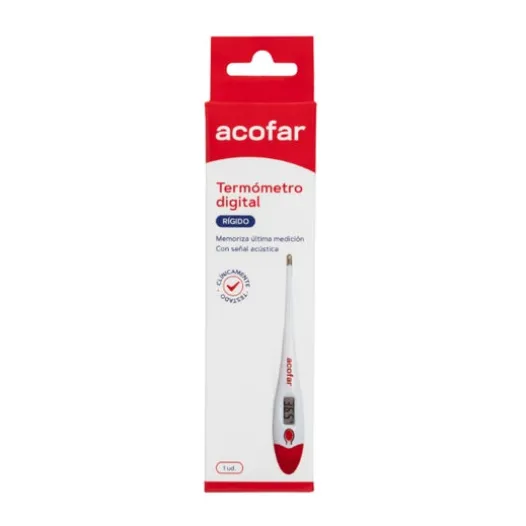 Das Acofar Digitalthermometer verfügt über einen Alarm, der das Ende der Temperaturmessung anzeigt und einen Speicher für die zuletzt gemessene Temperatur zum Vergleich. Mit Messfühler, Display, Starttaste und Schutzabdeckung für das Batteriefach. Empfohlen für die Messung der Körpertemperatur mit technologischer Präzision.