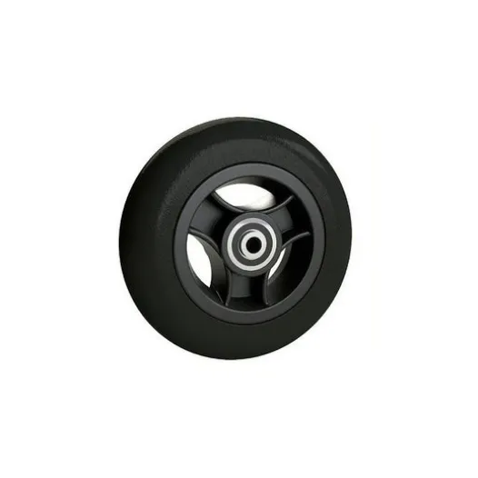 Massives schwarzes Rad für den Austausch gegen einen Rollstuhl. Sie entspricht dem vorderen Teil der Maschine und misst 125 mal 32 Millimeter. Er hat eine Blechfelge und schwarzes Gummi. Es dient der Sicherheit des Patienten und hilft, Gewichte auf einfache Weise zu bewegen. Es kann für manuelle Bewegungen, Fliesen-, Asphalt- und Zementböden verwendet werden.