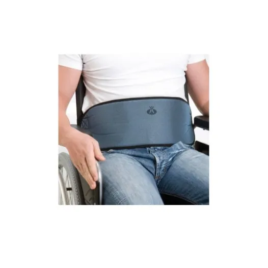 Der Bauchgurt und sein perineales Stück sind aus atmungsaktiven und halbsteifen Materialien mit drei Schichten (Schaumstoff, Polyester und Polyamid) hergestellt. Er verfügt über Verschluss-Schnallen und Befestigungsriemen zur Erleichterung des Anlegens durch den Patienten, die durch einen Farbcode identifiziert sind. Der Beckengurt mit perinealem Gurt ermöglicht es dem Patienten, an Ruhe-Systemen befestigt zu werden und gleichzeitig Bewegungsfreiheit im zervikalen dorsalen Bereich zu haben. Die Patienten, für die dieses Produkt bestimmt ist, sind solche, die eine gute anterolaterale Kontrolle während des Sitzens haben und dazu neigen, vom Sitz zu rutschen.