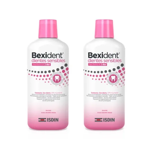ISDIN Bexident Sensitive Teeth Mouthwash Pack 2x500ml ist eine Packung mit zwei alkoholfreien Mundspülungen, die mit Fluorid und Kaliumnitrat formuliert sind.