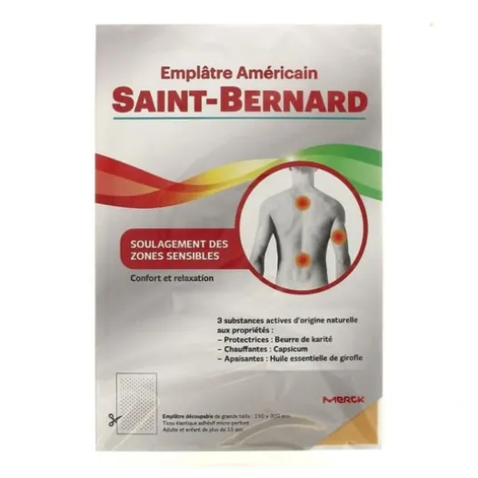 Saint-Bernard Amerikanischer Gips 19cmx30cm ist ein mikroperforiertes elastisches Klebegewebe, das Muskel- und Gelenkschmerzen, hauptsächlich rheumatischen Ursprungs, lindert. Es kann zugeschnitten werden, um sich bestmöglich an den betroffenen Bereich anzupassen.