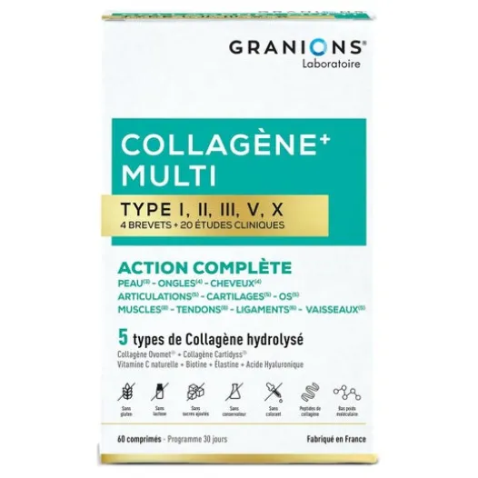 Granions Multi Kollagen Typ i-II-III-V-X 60comp ist ein Nahrungsergänzungsmittel, das 5 Arten von Kollagen kombiniert, hauptsächlich marines Hydrolysat (<2000 Dalton), mit Vitaminen und Mineralstoffen zur Unterstützung der Gesundheit von Haut, Haaren, Nägeln und Bindegewebe.