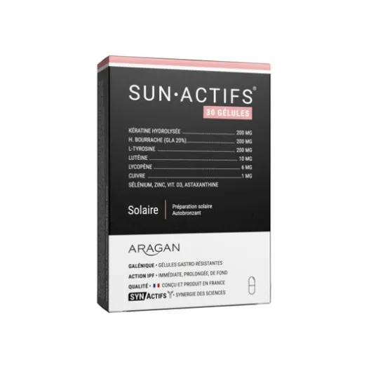 Synactifs Sunactifs 30 Kapseln ist ein Nahrungsergänzungsmittel mit Vitaminen, Aminosäuren, Zink, Kupfer, Carotinoiden, Spurenelementen und hochkonzentrierten getrockneten Pflanzenextrakten, die dazu beitragen, die Zellen vor oxidativem Stress zu schützen. Die Wirkstoffe der Formel tragen dazu bei, die Hautzellen vor vorzeitiger Alterung durch äußere Einflüsse und UV-Strahlen zu schützen und gleichzeitig eine normale Pigmentierung und einen normalen Hautton zu erhalten. Nahrungsergänzungsmittel sollten niemals eine gesunde, abwechslungsreiche und ausgewogene Ernährung und eine gesunde Lebensweise ersetzen.