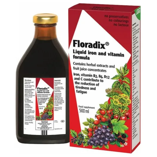 Floradix® Eisen + Vitamine 500ml ist ein Multivitamin-Nahrungsergänzungsmittel , das zur Stärkung des Körpers beiträgt und die korrekte Bildung des Blutgewebes fördert.
