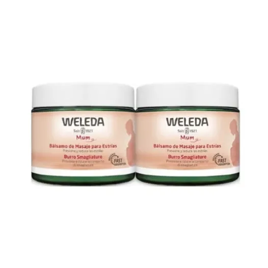 Weleda Stretch Mark Massage Balm 2x150ml ist ein Set, das zwei Massage-Balsame mit Anti-Dehnungsstreifen Wirkung enthält. Mit einer 100% natürlichen Formel und einer leichten Textur, die seine Absorption erleichtert, hilft dieser Balsam, die Elastizität der Haut zu verbessern und trägt dazu bei, das Auftreten von Dehnungsstreifen zu verhindern. Er ist angereichert mit Centella Asiatica-Extrakt, Sheabutter und Kakaobutter, die als Weichmacher die Haut mit Feuchtigkeit versorgen. Enthält zwei Flaschen mit je 150 ml.