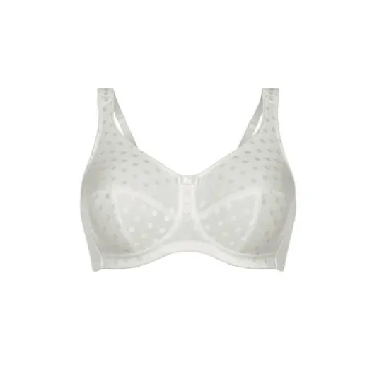 Bügelloser Komfort-BH mit dreiteiligen Cups, die den Busen formen und gleichzeitig festen Halt bieten. Aus leichtem, luftigem Jacquard-Stoff mit Polka-Dot-Muster auf den Körbchen und Trägern sowie einer dezenten Schleife am Steg. Die Träger sind breit, weich und verstellbar, damit sich der BH an die Konturen des Körpers anpasst.