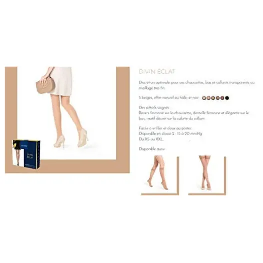 Die Sigvaris Ch/Sigv Divin2 Eclat nude S N Kompressionsstrümpfe von Sigvaris sind darauf ausgelegt, tagsüber Wohlbefinden zu bieten. Dieses Produkt zielt darauf ab, die Blutzirkulation in den Beinen zu verbessern. Darüber hinaus ist es ein idealer Verbündeter, um die Auswirkungen der Schwangerschaft auf die Beine und andere Beschwerden, die durch Operationen oder Sklerotherapie von Krampfadern entstehen, zu lindern. Trotz der medizinischen Funktion vernachlässigt es nicht das ästhetische Erscheinungsbild und präsentiert ein dezentes Design. Diese Kompressionsstrümpfe haben eine reduzierte Zehen- und Fersenpartie und keine Sohle, sodass sie mit offenen Schuhen getragen werden können. Die Verwendung wird insbesondere während der wärmeren Monate empfohlen. Das Produkt richtet sich an Personen, die unter den oben genannten Beschwerden leiden. Dennoch ist es immer ratsam, die Meinung eines Arztes einzuholen.