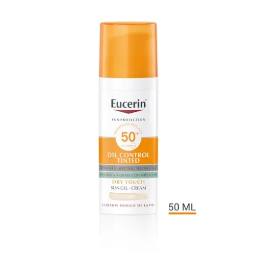 Eucerin Sun Oil Control Dry Touch Gel-Cream Light Tone SPF50+ 50ml ist ein Sonnenschutz für die tägliche Anwendung im Gesicht mit Farbe im Gel-Creme-Format für fettige und zu Akne neigende Haut.Formuliert mit der Advanced Spectral Technology, die UVA/UVB-Filter für einen sehr hohen UV-Schutz und Lycohalcone A kombiniert, um freie Radikale zu neutralisieren, die durch UV-Strahlen und hochenergetisches sichtbares Licht entstehen.Außerdem enthält es die Oil Control Technology, die die Talgproduktion der Haut durch L-Cartinin reguliert, sowie absorbierende Mikropartikel, die einen lang anhaltenden Anti-Glanz-Effekt bewirken.Leichte, schnell einziehende Textur. Lang anhaltendes, mattes Finish. Geeignet für fettige und/oder zu Akne neigende Haut.