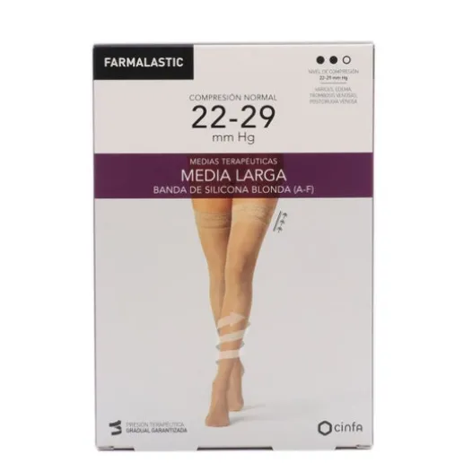 Der Farmalastic T-M Strumpf Normal Compression Blonda camelfarben ist ein 140 Denier Strumpf, der speziell für Personen in Behandlung von Venenerkrankungen und schwangere Frauen mit Neigung zu Ödemen geeignet ist. Er hinterlässt keine Gummiabdrücke an der Wade und drückt nicht auf die Zehen. Er wird mit einer Silikonspitze geschlossen und ist viel eleganter als kurze Strümpfe. Er entspricht einer mittleren Größe mit einem Wadenumfang von 34-36 cm, einem Knöchelumfang von 22-23 cm und einem Oberschenkelumfang von 45-47 cm*Aus hygienischen Gründen wird dieses Produkt weder umgetauscht noch zurückgenommen.