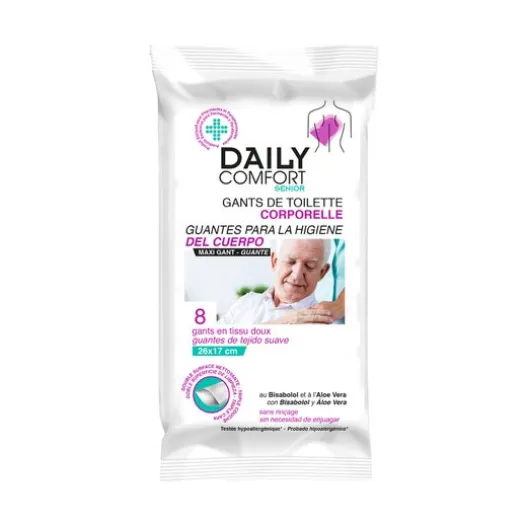 Handschuhe für die persönliche Hygiene, Produkt mit innovativer Formel und Präsentation. Die beruhigende Formel mit reinigender Wirkung stellt den physiologischen pH-Wert wieder her und verhindert Rötungen. Die große Größe des Handschuhs und die Möglichkeit, ihn beidseitig zu verwenden, erleichtern die Reinigung, indem die Reinigungsfläche verdoppelt wird. Das weiche Gewebe des Handschuhs und seine Form erleichtern die Reinigung, und seine Formel mit Bisabolol und Aloe vera spendet der Haut intensive Feuchtigkeit. Kein anschließendes Ausspülen erforderlich.