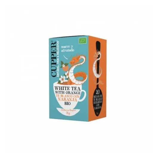 Ökologische Infusion von Cupper, hergestellt aus klassischem weißem Tee und Orange, leichter, köstlicher und sehr erfrischender Bio-Tee aus jungen Trieben und Blättern des Teestrauchs. Stammt aus China, der traditionellen Heimat des weißen Tees. Cupper verwendet Lieferanten und Produkte von höchster Qualität, es werden keine künstlichen Zusätze hinzugefügt. Die Mischung enthält: Bio-Weißtee.