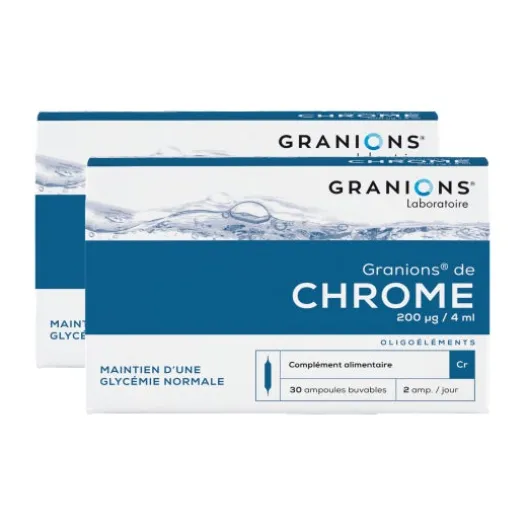 Granions De Chrome 2×30 Ampullen ist ein Nahrungsergänzungsmittel, das zur Aufrechterhaltung eines normalen Blutzuckerspiegels beiträgt. Chrom ist ein Spurenelement, das für den Stoffwechsel der Makronährstoffe (Kohlenhydrate und Fette) und das reibungslose Funktionieren des Körpers unerlässlich ist. Es fördert die Insulinaktivität und ermöglicht eine effizientere Nutzung des Blutzuckers. Nahrungsergänzungsmittel sollten niemals eine gesunde, abwechslungsreiche und ausgewogene Ernährung und eine gesunde Lebensweise ersetzen.