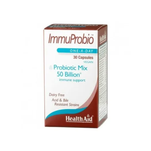Health Aid ImmuProbio 50000 Million Probiotics ist ein Nahrungsergänzungsmittel auf der Basis von 10 verschiedenen Stämmen von Probiotika, die Ihnen insgesamt 50 Milliarden lebensfähige Mikroorganismen liefern, sowie 189 mg Fructooligosaccharide, die auch eine präbiotische Wirkung haben.