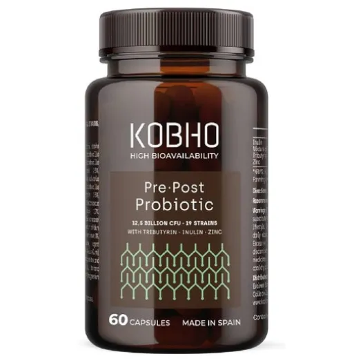 Kobho Pre-Post Probiotic 60 Kapseln ist ein Nahrungsergänzungsmittel, das mit Präbiotika, Probiotika und Postbiotika sowie Zink formuliert ist und zur Gesundheit der Darmmikrobiota beiträgt.