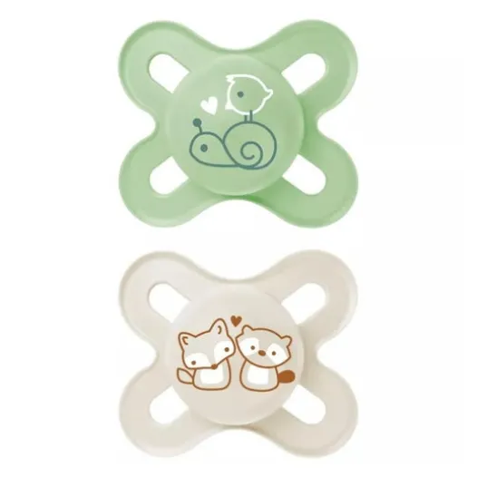Mam Start Pure Schnuller Silikon 0-2M Grün Beige 2 Stück ist ein Set aus zwei Schnullern, die helfen, Babys von 0 bis 2 Monaten zu beruhigen.Entwickelt mit einem flachen und symmetrischen Sauger aus MAM SkinSoft™-Silikon, der sich an den Mund des Babys anpasst und eine korrekte Entwicklung der Zähne und des Kiefers ermöglicht.Enthält eine Box für den Transport und die schnelle und einfache Sterilisation des Schnullers (in wenigen Minuten in der Mikrowelle).
