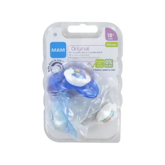 Der MAM Original 18+ Monate Silikonschnuller unterstützt die Entwicklung des Mundes Ihres Babys und lässt die Haut dank seiner großen Öffnungen atmen. Der ultradünne, flexible Sauger ermöglicht es, den Mund in einer natürlicheren Position zu schließen. Reduziert das Risiko von Zahnfehlstellungen. Hergestellt aus ultraweichem SkinSoft-Silikon, das zu einem vertrauten Gefühl beiträgt, so dass der Schnuller leichter angenommen wird. Die natürliche Saugwirkung des Schnullers hilft, das Baby zu beruhigen, ihm Sicherheit zu geben und Spannungen abzubauen. Alle Mam-Produkte sind aus BPA- und BPS-freien Materialien hergestellt. *Produktfarbe und -design können je nach Verfügbarkeit variieren.
